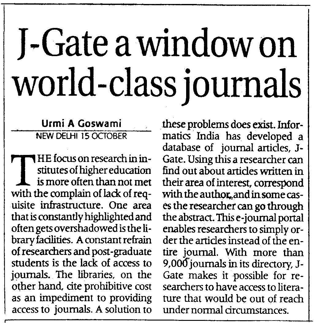 All Posts, Clippings J-Gate a window on world-class journals (The Economic Times New Delhi, 16th October 2002) Posted by admin On October 16, 2002 Comments Off on J-Gate a window on world-class journals (The Economic Times New Delhi, 16th October 2002)
