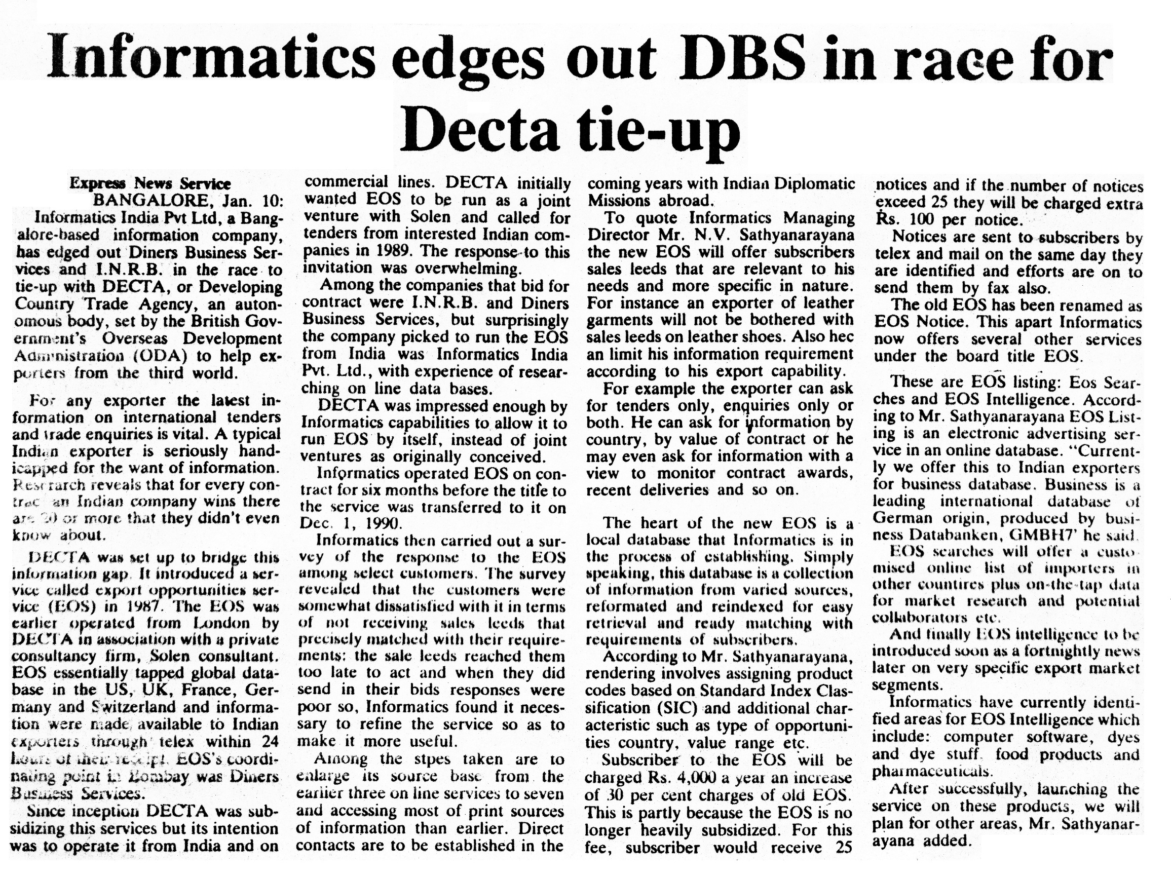 All Posts, Clippings Informatics edges out DBS in race for Decta tie-up (Indian Express, 11th January 1991) Posted by admin On January 11, 1991 Comments Off on Informatics edges out DBS in race for Decta tie-up (Indian Express, 11th January 1991)