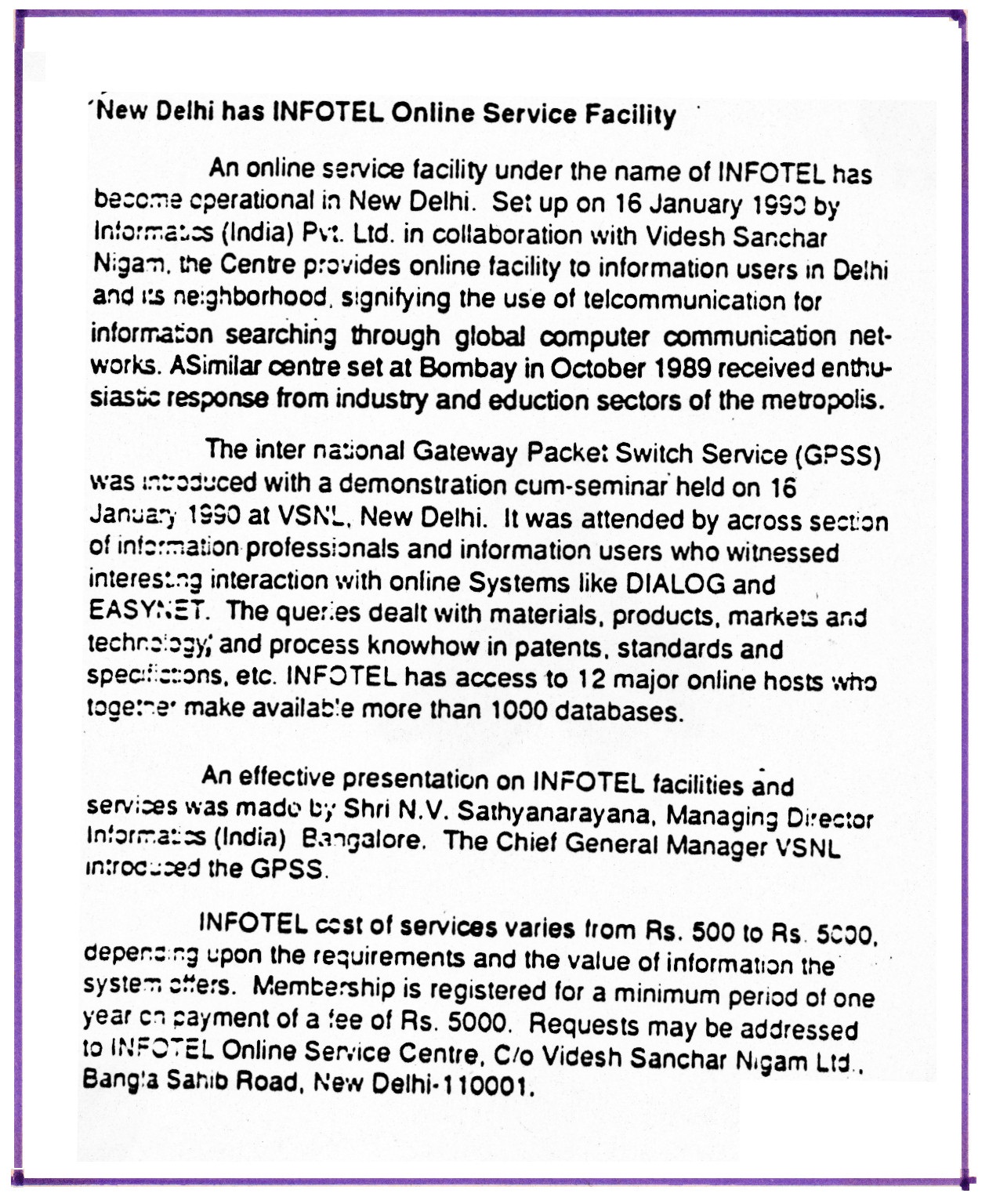 All Posts, Clippings New Delhi has INFOTEL Online Service Facility (NISSAT Newsletter, January-March 1990) Posted by admin On January 1, 1990 Comments Off on New Delhi has INFOTEL Online Service Facility (NISSAT Newsletter, January-March 1990)