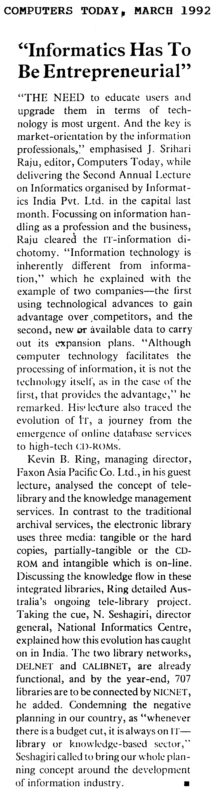 Informatics Has To Be Entrepreneurial (Computers Today, March 1992)
