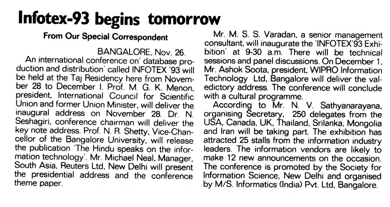 27 Nov All Posts, Clippings Infotex-93 begins tomorrow (The Hindu, 27th November 1993) April 13, 2023 By admin Continue reading