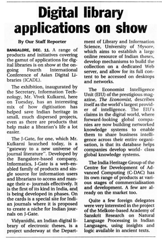 12 Dec All Posts, Clippings Digital library applications on show (The Hindu, 12th December 2001) April 13, 2023 By admin Continue reading