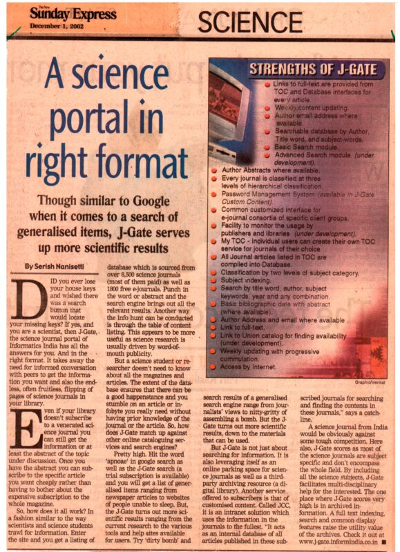 01 Dec All Posts, Clippings A science portal in right format (Sunday Express, 1st December 2002) April 13, 2023 By admin Continue reading